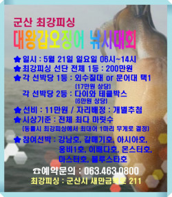 ◆최강피싱 최강선단◆◆대왕갑오징어 낚시대회 일정 알립니다◆오늘 조황보니 군산에 왕갑이들이 출몰했더이다ㅋ다들 달려보십시다요!!예약문의 : 063.463.0800(통화가 부끄럽거든 문자도 OK 010.9882.3088)▼▼홈피로 바로 예약▼▼http://strong.sunsang24.com/===== 군산 마스터호 예약안내 =====예약문의 : 010-3920-8582오시는길 : 전북 군산시 새만금북로 269 군산낚시프라자홈페이지 : http://master.sunsang24.com/밴 드 : 군산마스터호 계좌안내 : 수협 / 2010-0844-9135 / 김병철