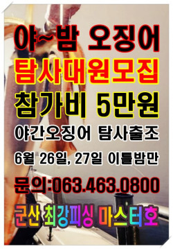 군산 마스터호 6월 26일, 27일 이틀간 야간 오징어 탐사출조합니다탐사대원 모집중입니다(참가비 5만원)뜨거운 낮을 피해 밤에 낚시를 즐기실 분들 탐사대원으로 환영합니다^^예약문의 : 063.463.0800 ===== 군산 마스터호 예약안내 =====예약문의 : 010-3920-8582오시는길 : 전북 군산시 새만금북로 269 군산낚시프라자홈페이지 : http://master.sunsang24.com/밴 드 : 군산마스터호 계좌안내 : 수협 / 2010-0844-9135 / 김병철